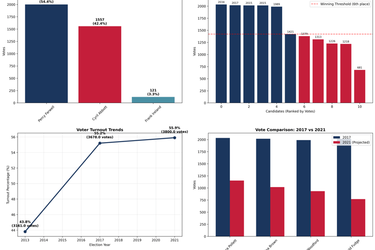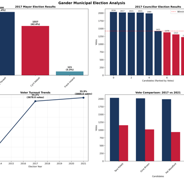 Analysis of 2017 and 2021 Gander municipal elections showing vote patterns and turnout trends.
